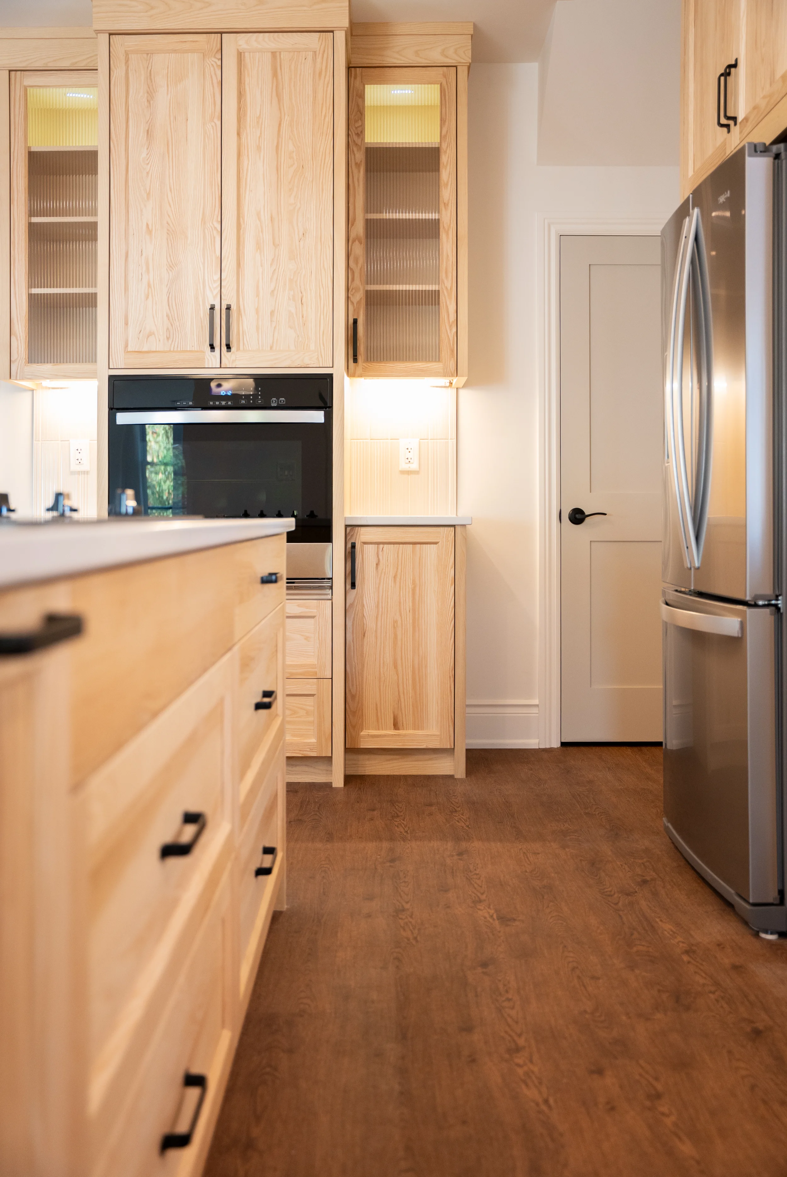 A streamlined layout maximizes efficiency while maintaining openness to adjacent living spaces.Custom cabinetry provides concealed storage, reducing visual clutter and enhancing the clean architectural language. Carefully selected finishes introduce warmth and texture, balancing modern minimalism with inviting materiality. Selected for its strength, durability,and distinctive grain pattern, Canadian ash introduces a natural warmth that softens the kitchen’s modern lines. The wood’s subtle tonal variation creates movement across the cabinetry surfaces,adding depth while maintaining a refined and cohesive aesthetic.