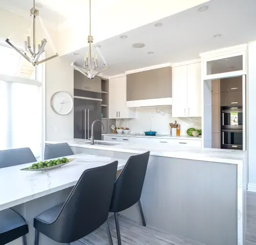 A notable element of this home is its sleek staircase, which we built from scratch. Its modern, non-traditional design contributes to the space’s open feel. It also features a handcrafted railing, shaped and installed by our team (Including all required joinery).