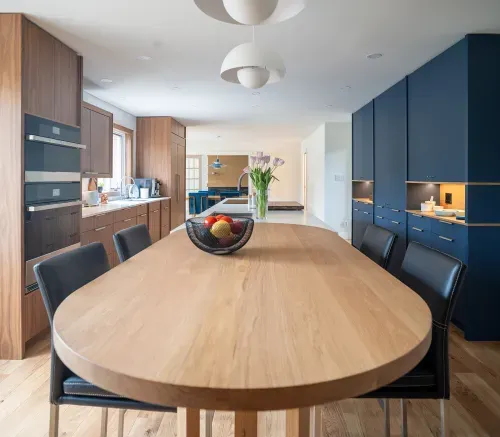 We consulted on the overall design for this new space, which successfully incorporates both a clean look and a warm feel. Minimal forms and a thoughtful selection of materials helped strike this balance. The home’s many windows offer plenty of light, while the wood infuses a warmth and an inviting energy.